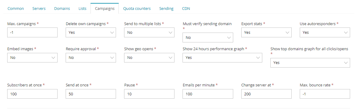 Similar to the Lists option you can restrict your customer for campaigns as well, like how many they can create, they can delete it or not and send to how many lists at once.