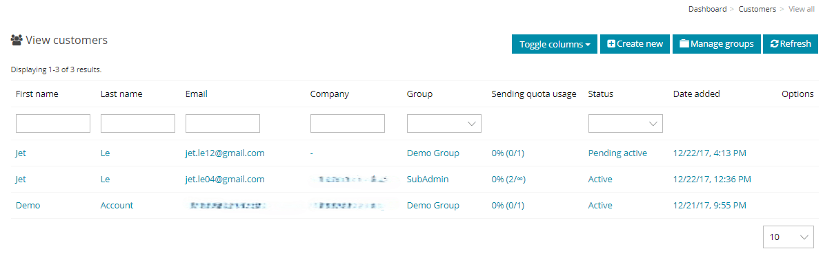 You can create any new customer with their details like Name, Email, Password, Timezone etc and you can assign them different Groups based on their usage and restrictions.