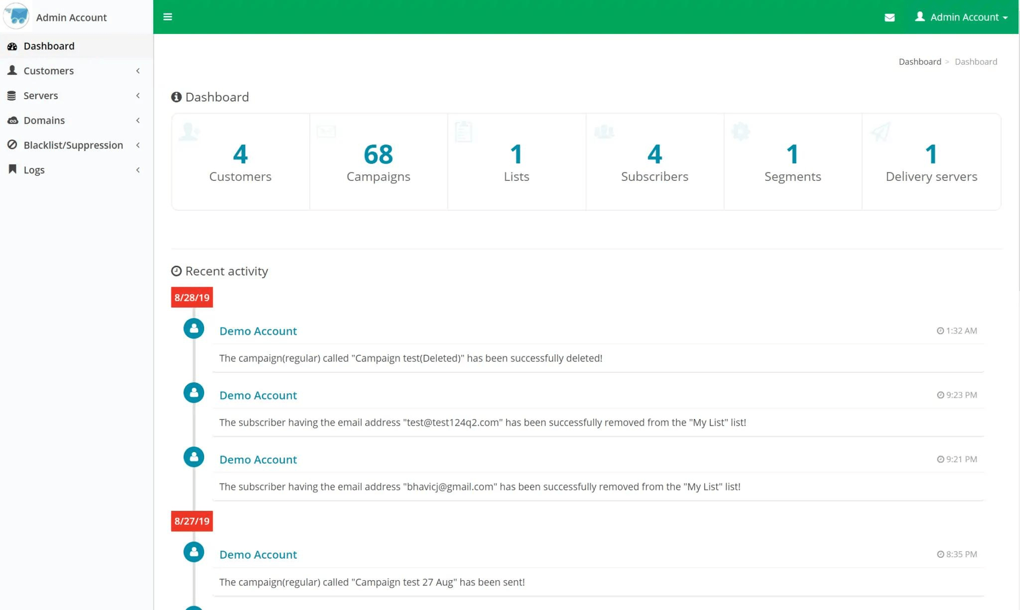 Similarly, you can see the other activity with respect to what you recently did, such as Campaign, List, Subscriber, Segments, and Delivery Servers with each expands.